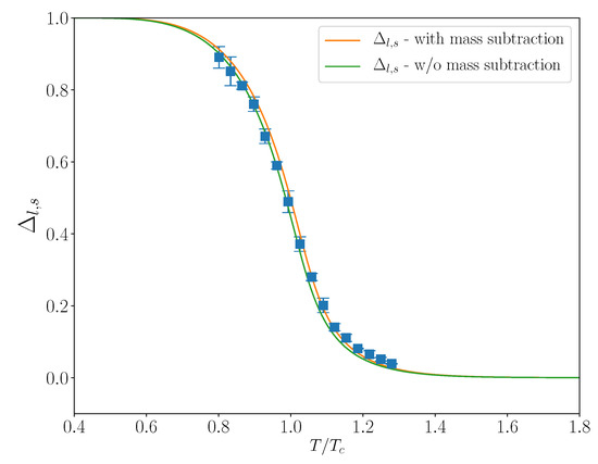 The relative-temperature dependence of the (normalized) subtracted quark condensate (19) from the lattice [83] (blue squares) and from our condensates. Slightly lower, green curve results from our unsubtracted condensates plugged in Equation (19), while the very slightly higher, red curve is from our already subtracted condensates.