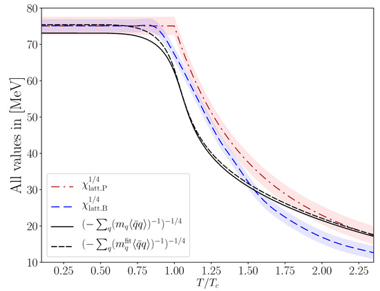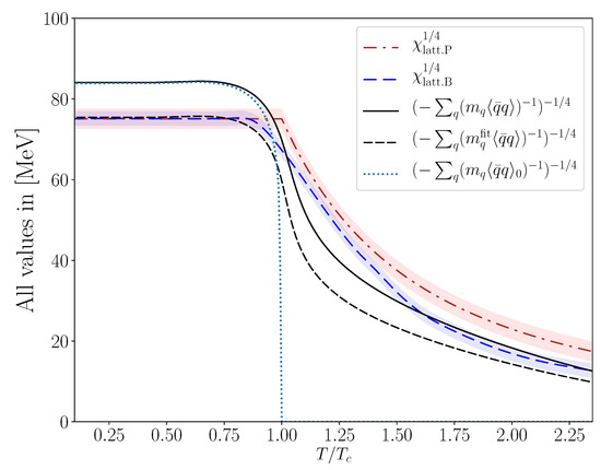 Contrary to, e.g., Ref. [48], where the condensate of massless quarks was used, in Ref. [17] and here we follow Shore [69] in using condensates of light quarks with nonvanishing current masses. The smooth, crossover behavior around the pseudocritical temperature for the chiral transition (now confirmed at vanishing baryon density by lattice studies such as [44,67,68,70,71]), is obtained thanks to the DChSB condensates of realistically massive light quarks—i.e., the quarks with realistic explicit chiral symmetry breaking [17].