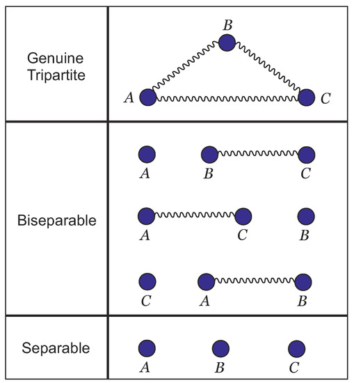 When dealing with tripartite quantum systems, it is possible to write the associated state in one out of three ways: totally separable , in terms of biseparable partitions () or genuinely entangled, which will be explained in the next part. In [24], Zhao and collaborators provide a set of methods based on expectation values of Pauli operators to identify the class of a given state. The possible configurations are presented in Figure 1.