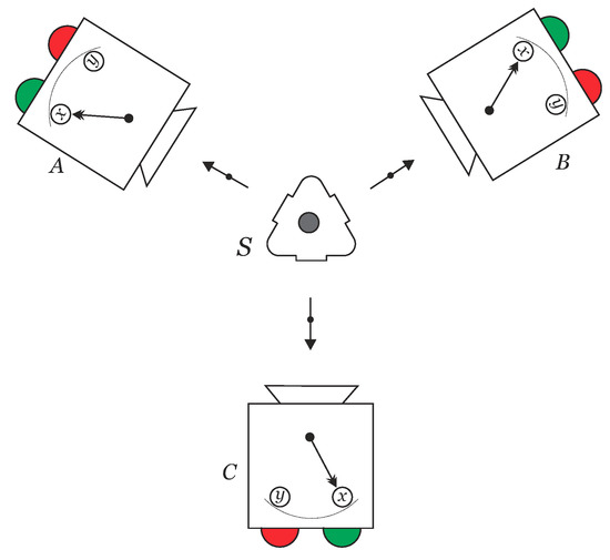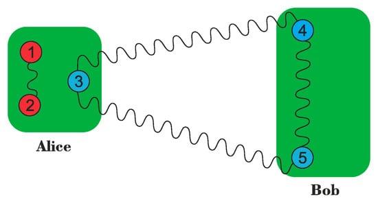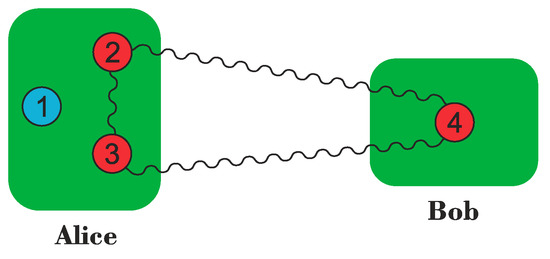 Thus, the state Charlie and Bob share is one out of the four states of the EPR basis (Equation (1), for ) and depends on Alice’s measurement result. It is important to note that the new state shared by Charlie and Bob is not a perfect EPR state because the coefficients of this state are and . If Alice obtains the state , for instance, Bob and Charlie share the state: