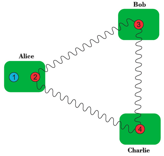 A scheme to perform quantum teleportation of a qubit state by using a GHZ state as the channel was developed in [72]. In this scheme there are three users, namely Alice, Bob, and Charlie, as shown in Figure 3. They share a GHZ state. Let Alice possess an additional qubit whose state she wants to teleport, . The state of the system is: