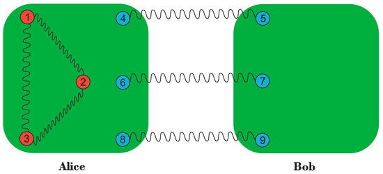 Consider three parties, Alice, Bob and Charlie, sharing a state as illustrated in Figure 2. Let us calculate . It means that Alice, Bob, and Charlie apply , , and locally on their qubits, respectively. This calculation gives: