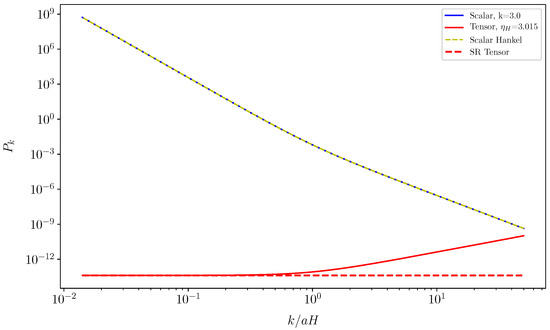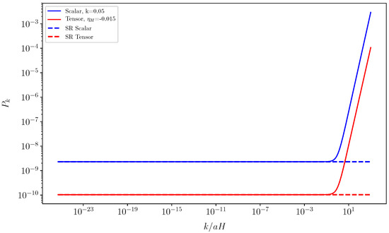 The scalar and tensor power spectra for the model (22) with . The solid lines are for the numerical results, and the dashed lines denote the asymptotic results with the slow-roll approximation.