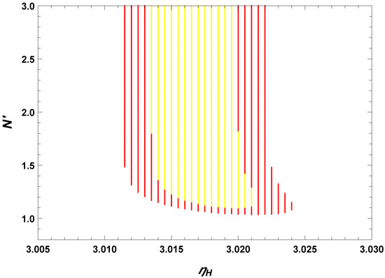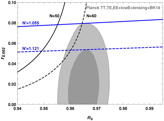 Substituting Equation (35) into Equations (14) and (15), we can calculate and r for the constant-roll inflation with increasing . Substituting Equation (37) into Equations (14) and (15), we can calculate and r for the constant-roll inflation with decreasing . The results along with the Planck 2018 and BICEP2 constraints [9,10] are shown in Figure 3. In Figure 3, the black lines represent the calculated results with Equation (35), and the blue lines denote the calculated results with Equation (37). The model with increasing is excluded by the observations if we take (the solid black line) and is marginally consistent with the observations at the 95% level if we take (the dashed black line). The constraint is at the 95% C.L for . The model with decreasing is consistent with the observations, we find that at the 68% C.L. and at the 95% C.L. The constraints on the parameters and for the model (37) are shown in Figure 4. We get at the 68% C.L., and at the 95% C.L. These results show that there is no duality between and .