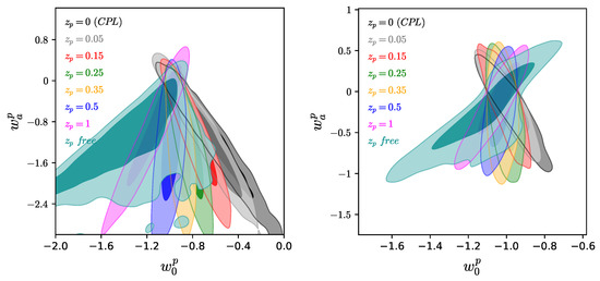 As we observe in Figure 10 for both datasets, by changing the values of the correlations between and change significantly. In particular, starting from a negative correlation present for (the original CPL parametrization), increasing the values leads to a rotation of the direction of the degeneracy between these two parameters. Therefore, we find a positive correlation for , as well as in the case where is left free. Finally, we can identify the value of the pivoting redshift for which and are no more correlated, and this is approximately for both datasets (the contours corresponding to (yellow) are vertical, showing no degeneracy). The changing of the correlations from negative to positive is one of the main results of this work.