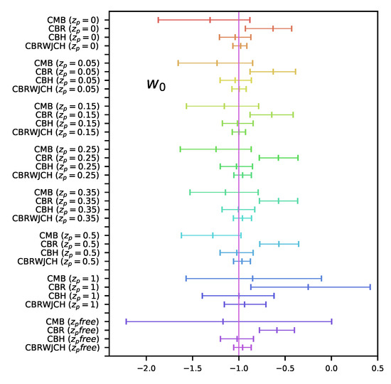 Summary of the 68% CL constraints on the standard CPL parametrization (7), namely without any pivoting redshift (), using various combinations of the observational data sets. Here, CBR = CMB + BAO + RSD, CBH = CMB + BAO + HST, and CBRWJCH = CMB + BAO + RSD + WL + JLA + CC + HST.