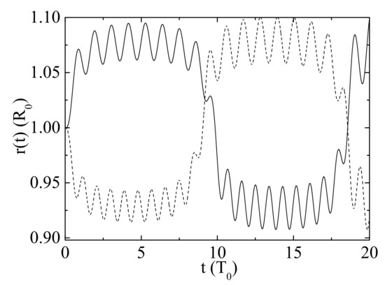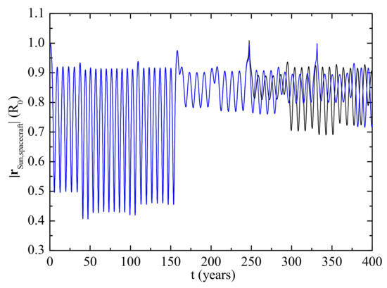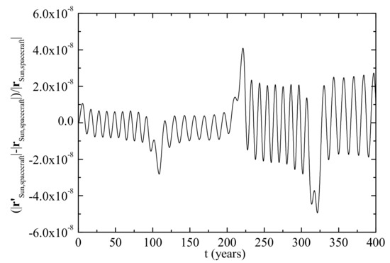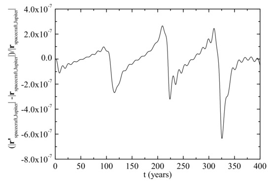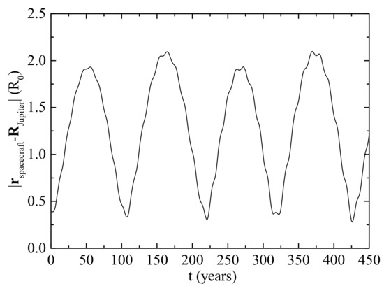 The semi-major axis of the spacecraft osculating orbit at the initial condition is given by (in units of ), where f is the ratio of the orbital period of the spacecraft with respect to Jupiter; i.e., for the resonance 2:1. According to Figure 1 we take the initial conditions for the spacecraft as , , , and . A symplectic partitioned Runge–Kutta method of difference order 4 was used for integration, with an initial step size, . Integration was carried out for a period of , corresponding to 237 years. The results for the distance of the spacecraft to the Sun in the resonance 1:1 (with ) are plotted in Figure 2. We observe a complicated, but periodic, pattern with no hint of chaos in this approximation. Anyway, it should be noticed that the large perturbations induced by Jupiter expel the spacecraft from the circular orbit at distances to the Sun ten per cent larger or smaller than the original distance.