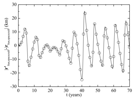 Difference between the distances of the spacecraft to the Sun as predicted for the post-Newtonian and Newtonian approximations in a resonant 1:1 orbit with . Integration by the Runge–Kutta order four method (solid line) and the fourth order Adams predictor-corrector method (open circles).