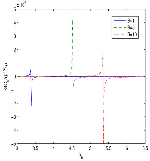 Figure 2 shows the similarity in the considered thermodynamics of our model and the thermodynamics of a neutral regular BH. It is seen from Figure 3 that second-order phase transitions at the discontinuity points occur between negative and positive heat capacities. Figure 2 shows that the maximum of the temperature (the Davies point), where the phase transitions take place, separates areas with increasing and decreasing BH temperatures. The unstable point between the positive and negative heat capacities has a discontinuity. The positive heat capacity corresponds to the late stage and the negative capacity to the early stage of the thermodynamics process. Thus, there is an interval of the horizon radius where the heat capacity is positive and the BH is stable. In accordance with Figure 2 and Figure 3, the heat capacity possesses a discontinuity at the horizon where the Hawking temperature possesses a maximum. When the parameter B is bigger, the second-order phase transition of the BH occurs at the larger value of the horizon radius (). For the large value of the BH is unstable ().