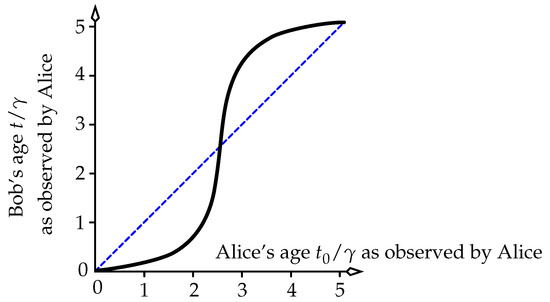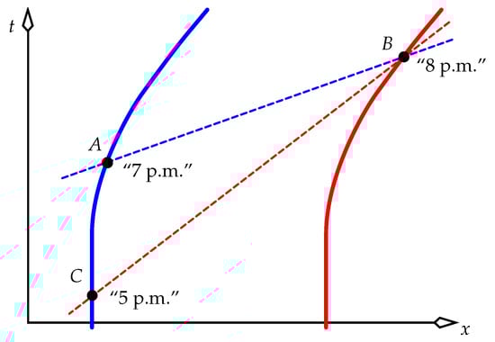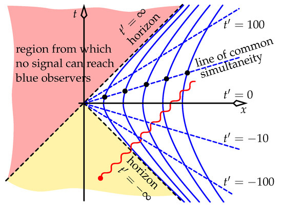 Details of how this uniformly accelerated frame is constructed using the MCIF at each event are given in [14,15], but the important point is that it is constructed from MCIFs. All of the accelerated observers will measure the distance between any pair of observers to be constant for all time. Also, each intersection of a solid blue world line (a hyperbola) and a dashed blue straight line is an event whose co-located observer’s line of simultaneity is precisely that dashed line. Thus, all observers agree that all events on any given dashed line (say, the black dots in Figure 5) occur at the same moment. These two facts of distance and time mean that the set of uniformly accelerated observers is indeed a frame. The events that they all agree are happening “now” can be allocated a single time coordinate: say, the proper time of a particular chosen “master” observer, who can be any of the observers. The observers’ clocks, if manufactured identically, will age (and thus tick) at different rates; but these clocks can be geared in such a way that they tick at the same rate. In that way, all observers can always say “When my clock displays 7 p.m., all other observers’ clocks display 7 p.m., even though I don’t see their clocks displaying this time right now, because it takes some time for their light to reach me.” The blue hyperbolae in Figure 5 define curves of constant (the accelerated frame’s space coordinate), and the dashed lines define events of constant , the frame’s time coordinate. The event at the origin of the figure’s axes is simultaneous with all events in the accelerated frame. In that frame, time at this event has slowed to a stop; and to this event’s left (), time runs backwards.