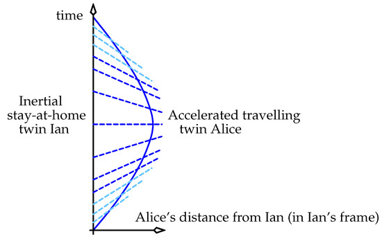 Alice’s description of Ian’s ageing is formed in the same way, by drawing Alice’s dashed line of simultaneity through a sample of events on her curved world line in the figure (as shown). When the twins are close together, Alice observes Ian to age slowly, because her line of simultaneity mostly translates through spacetime (successive snapshots of this line are drawn in light blue). Near their greatest separation, Alice observes Ian to be ageing quickly, because her line of simultaneity now rotates through spacetime (successive lines are drawn in dark blue). Finally, as Alice nears home, her line of simultaneity again mostly translates through spacetime (drawn light blue), and she again observes Ian to age slowly. (Be reminded that we are not discussing what Alice and Ian see here, as per my comment in Section 1.) Alice concludes that when she is accelerated, the common phrase “moving clocks tick/age slowly” applies only to clocks in her vicinity. Distant clocks can age at other rates.