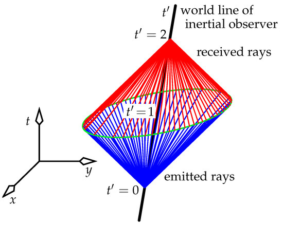 By symmetry in time, this set of light-bounce events must lie in a plane in Figure 6. This set must then be the result of slicing a cone with a plane: it is the green ellipse in that figure. We can also draw light cones for rays emitted before (after) and received after (before) , to conclude that the set of all events defined by the primed observer to occur at is the entire plane containing this ellipse. This plane of simultaneity is central to the rest of this paper.