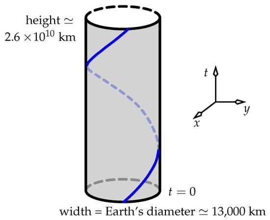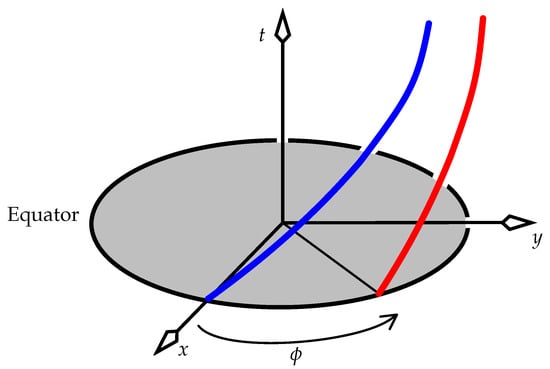 For example, suppose the ring is Earth’s equator, “spinning east” in the ECI, but with no gravity present (as we are doing a special-relativity analysis here). The above four clocks are always synchronised in the ECI, which is the inertial frame of Figure 7. Now recall the case in one space dimension, where a line of simultaneity for an observer of velocity v has a slope on a -versus-x spacetime diagram of . In two space dimensions, the plane of simultaneity has the analogous tilt in spacetime; thus, as it extends on Earth approximately a distance R (Earth’s radius) to Clock 90’s world line, it rises along the time axis by . The helical world lines of the comparatively slowly rotating clocks on Earth’s Equator (speed 465 m/s in the ECI) are almost parallel to the t axis of Figure 7 [proof: see the analysis around (6)]. This rise is then