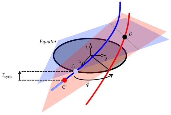 Reproduced from [6]. A set of helical world lines of four clocks on a rotating ring. Clock 0’s grey plane of simultaneity at the black-dot event A is shown, constructed by the procedure of Figure 6. It intersects the three world lines of Clocks 90, 180, and 270 at events respectively.