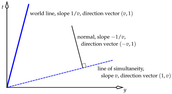 It’s immediately clear that in the laboratory frame (which has the black axes in Figure 1), the two events A and B occur at different lab times. When we fill the space with a continuum of clocks that all share the same velocity in the lab, all events on the line containing A and B will be defined by all the moving clocks to be simultaneous with A and B, for the case of one spatial dimension in Figure 1. This line of events is the “line of simultaneity” at any event on that line for the frame of the moving clocks. If we augment Figure 1 with another space dimension (a y axis normal to the page), all events simultaneous with A and B will lie on a plane of simultaneity, whose normal lies in the plane of the page.
