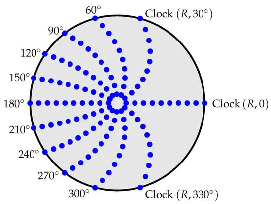 Clock 0’s plane of simultaneity cuts Clock 90’s world line 33 ns into Clock 0’s future. At this moment, Clock 90 is slightly east of exactly 90 from Clock 0, using the degree unit of the inertial lab. Hence Clock 0 measures Clock 90’s angular distance (using the degree unit of the inertial lab) to be slightly greater than 90; the true value for Earth’s size and spin rate is about . Similarly, Clock 0’s plane of simultaneity cuts the world line of Clock 180 such that Clock 0 says that its own time equals that shown on Clock 180 at this moment. Clock 0 then measures Clock 180’s angular distance to be exactly 180. Lastly, Clock 0 measures Clock 270’s angular distance as . Extending this argument to a continuum of clocks fixed to the perimeter, Clock 0 measures these clocks to crowd toward Clock 180. This is depicted later in Figure 14.