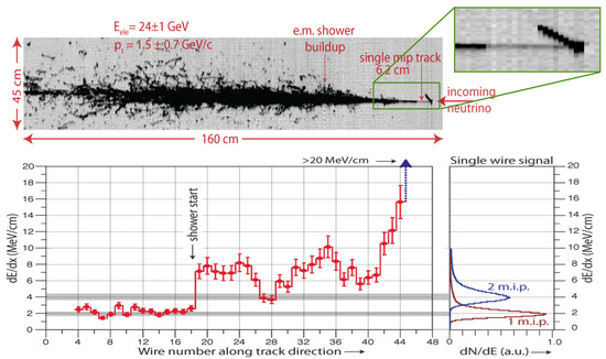 CC CNGS event in the 2D Collection view of ICARUS-T600 (top) with the corresponding evolution of ionization density, dE/dx, in the first wires with the marked shower onset (bottom). The expected dE/dx signals for 1 and 2 minimum ionizing particle (m.i.p.) are also shown [20].