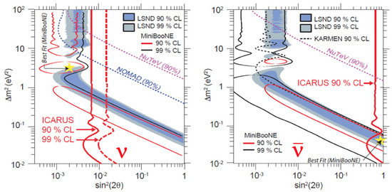 - Aguillar, A.; et al.; [LSND Collaboration] Evidence for neutrino oscillations from the observation of appearance in a beam. Phys. Rev. D 2001, 64, 112007. [Google Scholar] [CrossRef]