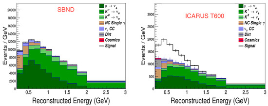 Expected CC event distributions at the near SBND (left) and far ICARUS-T600 (right) detectors, corresponding to a protons on target (POT) exposure at the Booster Neutrino Beam (BNB). The oscillation signal refers to eV and . The misidentified neutral-current and CC events, out-of-detector beam-related backgrounds, and cosmogenic photon-induced electromagnetic shower backgrounds are also included [21].