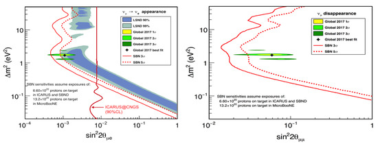 The expected sensitivity to (left) and the corresponding expected sensitivity to disappearance (right) provided by the SBN program, compared to the LSND positive result and to a global best fit expectation of all present neutrino anomalies [22]. A total exposure of POT at the BNB beam for the SBND and ICARUS detector and POT for the MicroBooNE detector have been considered [23].