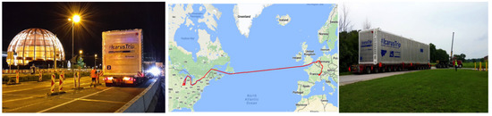 The so called icarustrip, the journey of the T600 detector from CERN to FNAL. In particular, on the left is a picture of the T600 detector leaving from CERN on 12 June 2017. In the middle, the map of the long journey of the detector, and finally, on the right, a picture of the T600 arriving at the SBN Far site building in Fermilab on 26 July 2017.