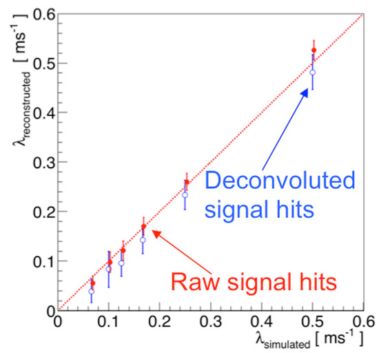 In parallel with the preparation and development of a very detailed simulation of the events, also the most important analysis tools developed and used during the Gran Sasso run have been imported and improved in view of the new analysis. For example, the method for the measurement and monitoring of the liquid argon purity condition, necessary as soon as the detector starts collecting events, has been updated taking into account the new experimental conditions: in fact, in the new data taking at FNAL, on average, ∼11 muon tracks are expected in each collected event, while in the Gran Sasso underground laboratory, only one muon was present in each triggered event [4]. In addition, the muon energy spectrum will also be different: in fact, ∼15% of the crossing muons will stop inside the detector. The first preliminary results provided by the updated method on a full simulation of cosmic rays events are shown in Figure 7 for different values of the electron lifetime.