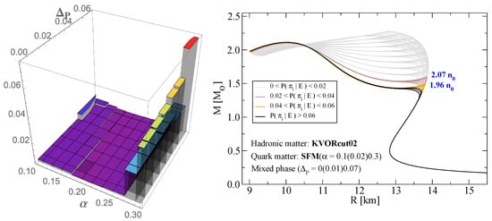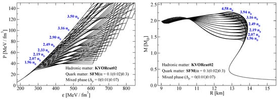The set of hybrid EoS obtained by the mixed phase construction for different values of and is shown in the left panel, while in the right panel the corresponding set of compact star sequences in the mass–radius diagram is shown. The blue numbers show selected values of critical densities for the onset of the phase transitions obtained by a Maxwell construction.