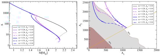 The recent observation of gravitational waves from the inspiral phase of the binary CS merger GW170817 gives an estimation of the tidal deformabilities and of these stars; therefore, we also include this information in the analyses. The tidal deformability of a star can be calculated from the Einstein equation for small elliptic deformation as described in []. For the results of the calculation, see Figure 2.
