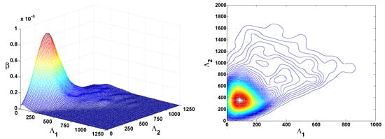 The PDF reconstructed with – data for GW170817 from the LIGO website [] as a 3D graphics (left panel) and as a contour plot (right panel).