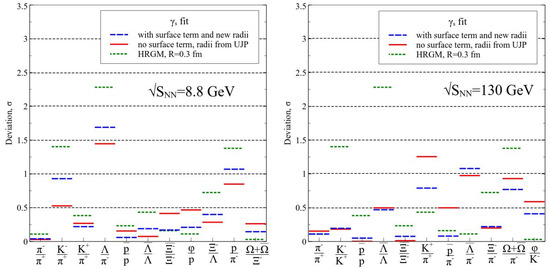 These results clearly demonstrate that additional 3 or 4 HCR can, indeed, essentially improve the quality of the fit of more than hundred independent hadron multiplicity ratios and, hence, such an improvement provides a high confidence in the extracted parameters of CFO. Apparently, this is also a strong argument in favor of fm found by the IST EoS. Moreover, from the left panel of Figure 1 one can see that the proton to negative pion ratio (short dashed line with the deviation value about 1.4) cannot be described within the HRGM1, while it is well described within either of the HRGM multicomponent formulations. From both panels of this figure one can see that the ratios involving negative kaons and (anti) are also not well described by the HRGM1.