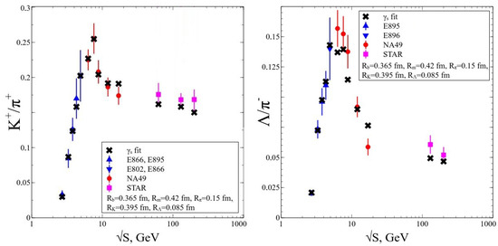 The parameter was fixed in Refs. [20,21], since this value allows us to simultaneously reproduce the third and forth virial coefficients of the gas of classical hard spheres. Such a formulation of the IST EoS is used to simultaneously fit 111 independent hadron yield ratios measured at AGS, SPS, and RHIC energies. In this fit the factor and the chemical potentials and are regarded as the free parameters and we found that the best description of these data is reached for the following HCR of baryons fm, mesons fm, pions fm, kaons fm, and -hyperons fm (new radii hereafter). These values of the HCR generate [21]. Some selected results of this fit are shown in Figure 1 and Figure 2.