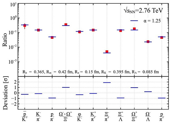 The results obtained by the IST EOS on fitting the ALICE data with the new hard-core radius (HCR) found in [20] from fitting the AGS, SPS, and RHIC data. The found chemical freeze-out (CFO) temperature is MeV. The fit quality is . The upper panel shows the fit of the ratios, while the lower panel shows the deviation between data and theory in units of estimated error.