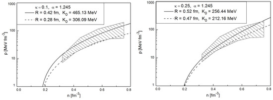 The QIST EoS with four adjustable parameters is able to simultaneously reproduce the main properties of symmetric nuclear matter, i.e., a vanishing pressure at zero temperature and the normal nuclear particle number density fm−3 and the value of its binding energy per nucleon MeV (where is the energy density). Hence, the baryonic chemical potential of nucleons is MeV. The QIST EoS with the attraction term (16) was normalized to these properties of nuclear matter ground state and, simultaneously, it was fitted [54] to obey the proton flow constraint [55]. The region in the pressure-density plane deduced from flow observables has become an easy-to-use standard to constrain the behavior of phenomenological EoS at supersaturation densities. See, e.g., Ref. [58] for its usage in the context of compact star astrophysics. Although at a given value of particle number density the allowed range of pressure values of symmetric nuclear matter is rather wide, it is not easy to obey it and to simultaneously achieve the available range range of the incompressibility constant , since they anti-correlate with each other.
