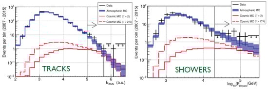 Event energy distributions of reconstructed events (black), Monte Carlo (MC) simulation of the expected atmospheric muon flux (blue), MC simulation of the expected cosmic neutrino flux (red). Left: track events. Right: shower events.