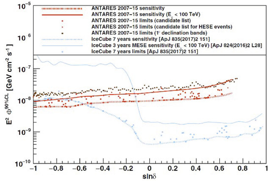 - Albert, A.; et al. [ANTARES Collaboration] New constraints on all flavor Galactic diffuse neutrino emission with the ANTARES telescope. Phys. Rev. D 2017, 96, 062001. [Google Scholar] [CrossRef]
