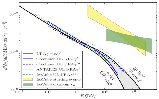 - Aartsen, M.G.; et al. [IceCube Collaboration] Constraints on galactic neutrino emission with seven years of IceCube data. Astrophys. J. 2017, 849, 67. [Google Scholar] [CrossRef]
