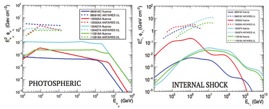 The ANTARES multi-messenger program includes also searches for neutrino fluxes from Gamma Ray Bursts (GRBs). They are the most energetic phenomenon of the Universe, and they release energies between and ergs in a few seconds. In the last years, two emission models have been proposed: the internal shock [20] and photospheric model [21]. Both models assume that the gamma ray emission is due to a relativistic jet of particles ejected by an inner engine, but the location of the interaction is different. In the case of the internal shock model, the gamma rays are produced by the interaction of different shock waves inside the jet (internal shock) and by the interaction of the jet with the interstellar medium (external shock). On the other hand, in the photospheric scenario, the interaction takes place in the initial part of the expansion of the jet, when it is still opaque to photons. The two different GRB emission models have been studied by the ANTARES collaboration, and the results are summarized in Figure 4.