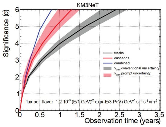Significance as a function of the Cubic Kilometre Neutrino Telescope (KM3NeT)-ARCA (two building blocks) observation time for the detection of a diffuse flux of neutrinos corresponding to the signal reported by IceCube for the cascade channel (red line) and muon channel (black line). The black and red bands represent the uncertainties due to the conventional and prompt components of the neutrino atmospheric flux. The blue line represents the results of the combined analysis.
