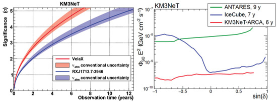 KM3NET results will allow interesting studies on the IceCube signal due to its complementarity in the field of view, energy range, and flavor coverage; its location in the Northern Hemisphere allows the study of muon neutrino events from the southern sky that are not detectable by IceCube (excluding HESE). KM3NeT-ARCA will also investigate the emission of neutrino flux from point-like sources [10]. As an example, in Figure 6 (left), the expected significance as a function of the observation time for two candidate sources VelaXand RXJ1713.7-3946 is shown. KM3NeT will have a significant discovery potential for extragalactic sources, complementing the IceCube field of view, as reported in Figure 6 (right).