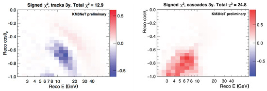 One of the main goals of KM3NeT-ORCA will be the determination of the Neutrino Mass Hierarchy (NMH). The atmospheric electron neutrino flux can undergo coherent elastic forward scattering with the electrons in matter, introducing a dependence on the sign of [23]. The dependence on matter interaction is inverted for neutrinos and anti-neutrinos, but an asymmetry is still detectable due to the difference in the neutrino and anti-neutrino charged-current cross-sections and slightly difference in atmospheric neutrino fluxes. This property is exploited by the KM3NeT detector to determine the neutrino mass hierarchy, studying atmospheric neutrinos over a range of energies and baselines. In Figure 7 the signed is shown as a function of reconstructed neutrino energy and cosine zenith for track-like events and cascade-like events, where and are the number of reconstructed neutrinos in the hypothesis of normal ordering and inverted ordering, respectively. An overall larger statistics-only sensitivity is observed for cascades [24].