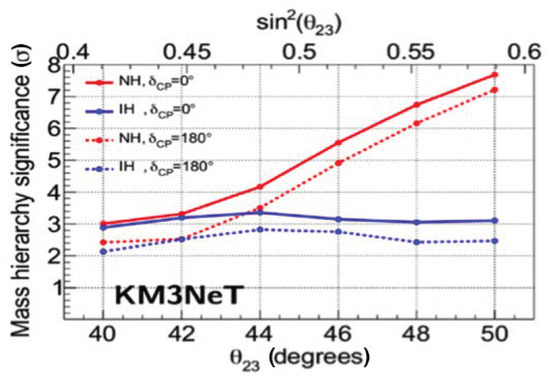 - Simon, B.; Liam, Q. [KM3NeT Collaboration]. Sensitivity of ORCA to the neutrino mass ordering and oscillation parameters. In Proceedings of the Neutrino 2018 - XXVIII International Conference on Neutrino Physics and Astrophysics, Heidelberg, Germany, 4–9 June 2018. [Google Scholar]