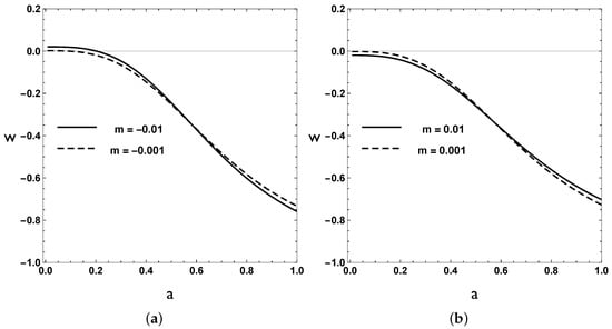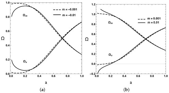 the geometric “matter” part contributes with . For different values of m, the fractional abundances and are visualized in Figure 1. Postulating a conservation equation , where now replaces Expression (85), this corresponds to an effective, time-varying EoS parameter of the geometric DE,