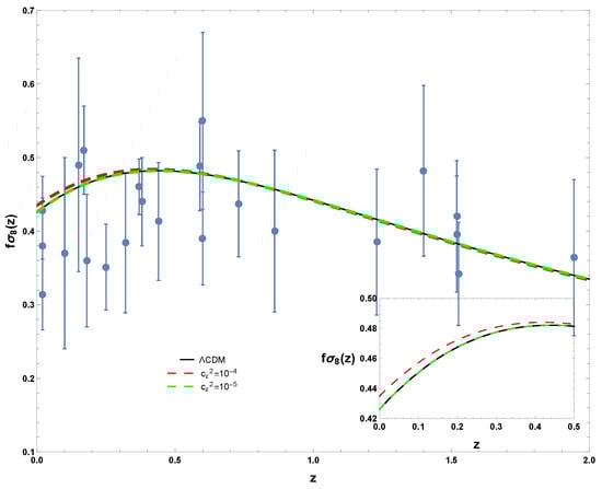 For the matter distribution variance today, we assume , which is compatible with standard fiducial cosmology as determined by the Planck satellite []. This value is biased with respect to the variance in the distribution of galaxies but the combination is independent from the bias factor []. The data of RSD measurements of used in our analysis are listed in Table 1. In the following, we study the influence of some of the model parameters on the growth of matter perturbations. Differences to the CDM model may already occur if there are isotropic pressure perturbations, described by a non-vanishing sound speed parameter. Our analysis shows that values of the order of are necessary to produce a noticeable impact (Figure 3).