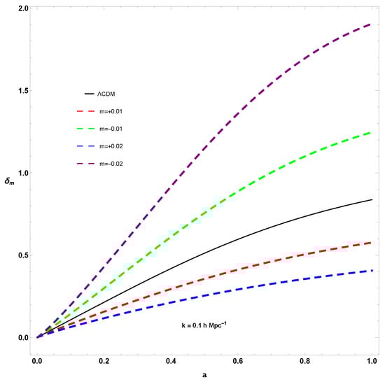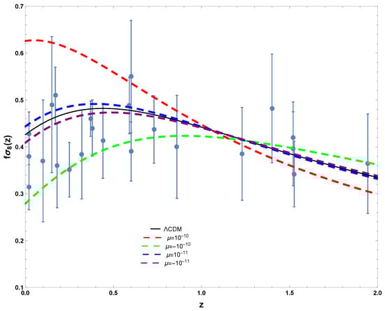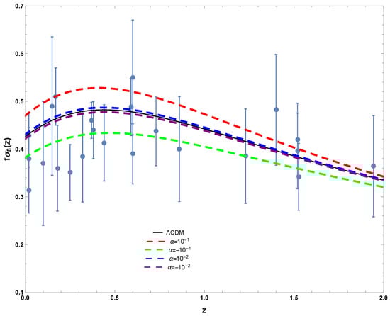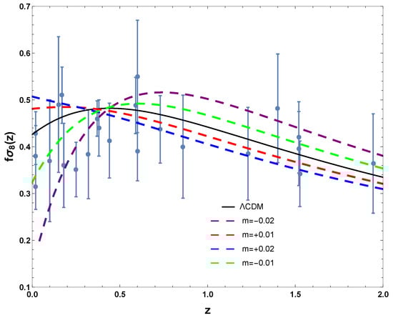 Figure 4 shows the fractional matter energy density perturbations as a function of the scale factor if only the parameter m is modified (different values of m for ) with respect to the CDM model (). The dependence of the growth rate on the redshift for these values together with the data points is shown in Figure 5. Positive values of m enhance the matter growth, negative values diminish it. Figure 6 visualizes the scale-factor dependence of the fractional matter density perturbations for different values of the anisotropic stress parameter for . The corresponding growth rate for different values of is shown in Figure 7. Deviations from the CDM model require values of of the order of . Finally, we demonstrate the impact of a non-vanishing heat flow, represented by the parameter , on the growth rate (see Figure 8). The heat flux basically causes a shift of the CDM curve (upward for , downward for ).
