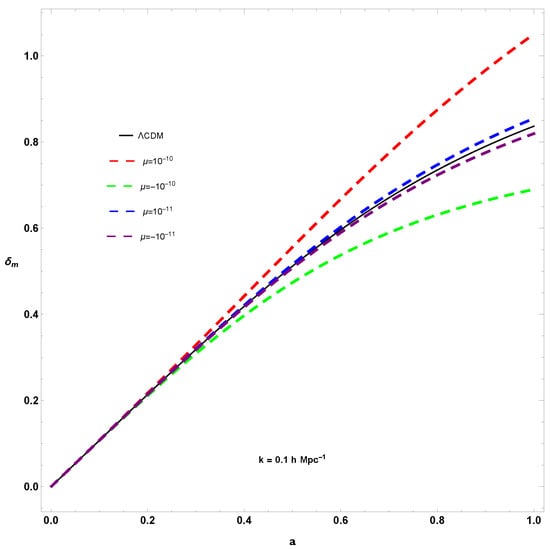 Now, we combine the general imperfect-fluid perturbation dynamics, established in Section 4, with the CDM background model of the previous section. The variable of interest, the fractional matter perturbation in Formula (75), is obtained via the solution of the coupled system (57) and (63) for and , respectively. Since on sub-horizon scales gauge issues are less important, we shall omit from now on the superscript and denote this quantity simply by . It is convenient to use also the linear growth rate f defined by . In most cases, observational data are provided for the combination where is the root-mean-square mass fluctuation in spheres with radius 8 h []. In the linear regime, one has []