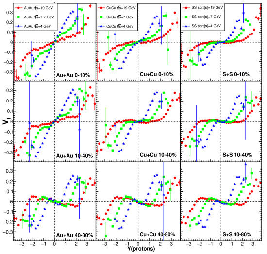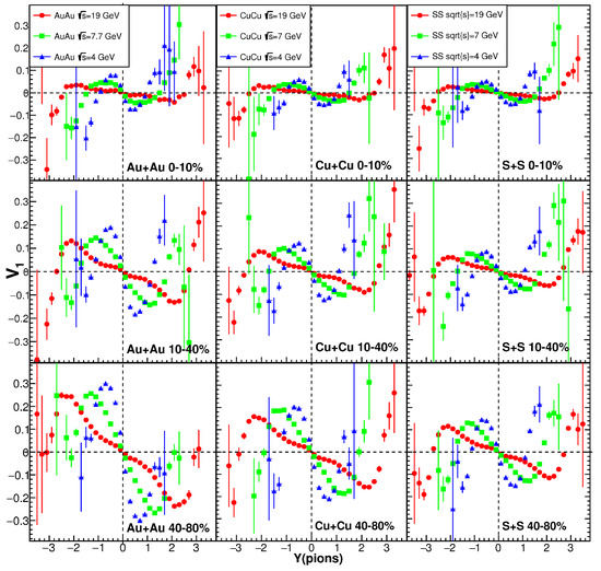 To investigate the basic features of the directed flow of pions and protons in microscopic models we opted for three bombarding energies, GeV, 7.7 GeV and 19 GeV, three systems of colliding nuclei, Au+Au, Cu+Cu and S+S, and three centrality intervals, 0–10%, 10–40% and 40–80%. We consider directed flow of protons, , first. These distributions are displayed in Figure 1. According to definition [20,21], if the product of particle momentum along x-axis and rapidity is positive, , the flow is considered as “normal”. In the opposite case, i.e., if , we call it “antiflow”. Note that at ultrarelativistic energies, the directed flow of both protons and pions at midrapidity is practically zero. Let us see how the directed flow of protons in Au+Au collisions is changing with decreasing collision energy from 19 GeV to 4 GeV. Firstly, calculations are done with the QGSM. For peripheral collisions has a characteristic wiggle structure, see bottom plots in Figure 1. It demonstrates weak antiflow at midrapidity. For semicentral Cu+Cu and S+S collisions with centrality 0–10% one sees antiflow at GeV, however, at GeV the directed flow of protons is already normally elongated. This transformation is happening because the flying away baryon-rich remnants of colliding nuclei are closer to midrapidity zone, and the directed flow of charged hadrons in the remnants is developed in normal direction. Moreover, transition from antiflow to normal flow occurs earlier (in energy scale) in heavy-ion collisions compared to the light-ion ones. The explanation of this effect is as follows [22,23,24,25]. Hadrons are produced more copiously in heavy-ion collisions than in light-ion collisions at the same centrality range. Hadrons emitted in the direction of nuclear remnants will interact further thus acquiring an extra momentum. These hadrons will be pushed from the midrapidity area to higher rapidity regions. For a light-ion system with lower multiplicity of secondary hadrons the loss of a few hadrons emitted in normal flow direction would be more noticeable compared to the heavy-ion system. It is worth noting that this effect is opposite to the reduction (or softening) of directed flow caused by the quark-gluon plasma (QGP) formation. The QGP is expected to be produced in (semi)central heavy-ion collisions rather than in light-ion ones. Therefore, the softening of proton directed flow at should set in earlier in Au+Au collisions compared to Cu+Cu or S+S collisions at the same energy.
