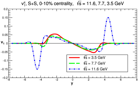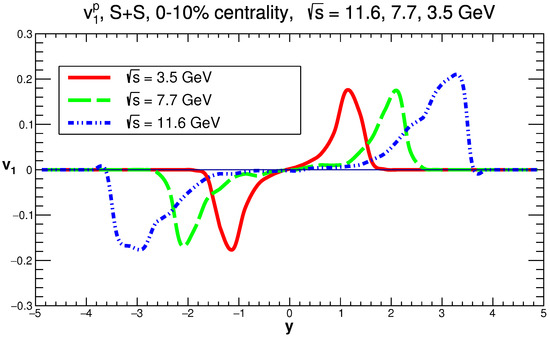 here y is rapidity, is particle transverse momentum, is the azimuth between the and the participant event plane, and is the azimuthal angle of the event plane of n-th flow component. The averaging in Equation (2) is performed over all hadrons in a single event and over all events. The first term in Equation (1) represents the isotropic flow, whereas the sum is related to the anisotropic flow. The first components of the latter are known as directed, , elliptic, , triangular, , flow, and so forth. It appears that in the energy range between GeV and GeV directed flow of protons at midrapidity, , changes its sign from “normal” (for definition, see below) to “antiflow”, whereas the directed flows of mesons and antiprotons remain antiflow-oriented. Also, it is well-known that the directed flow of hadrons should drop and even vanish in the vicinity of first order deconfinement phase transition [7,8,9]. This circumstance explains the interest to the study of directed flow at beam energy scan (BES) program at RHIC, at CERN SPS, and at future accelerators NICA JINR and FAIR GSI.