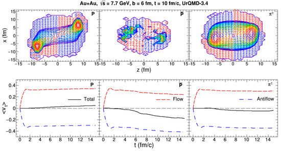 These features of the hadronic flow definitely need further investigation. Figure 5 (upper row) presents the snapshot of particle directed flows and densities for protons, antiprotons and charged pions in Au+Au collisions with the impact parameter fm at GeV after 10 fm/c of beginning of the collision. The whole space was subdivided into cells with volume fm. The arrows indicate the collective velocities calculated for each cell. Density contours show that spatial distributions of and are quite different. Protons are strongly influenced by the spectators, whereas the distributions of pions and antiprotons are more symmetric w.r.t. . The arising directed flow is a result of superposition of the partial flows in the cells, each having either positive (normal flow) or negative (antiflow) sign. Evolution of the directed flow of these three particle species at midrapidity is displayed in Figure 5 (bottom row). Although both normal flow and antiflow of all species are quickly developed within the first 1.5 fm/c, their resulting flow is weak compared to both flow and antiflow, components. It looks like the development of directed flow takes time longer than fm/c even at midrapidity.