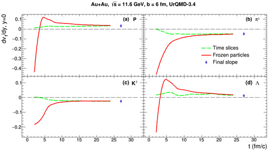 Our next investigation concerns the evolution of partial differential flows of protons, charged pions and kaons, and Lambdas at . Results of the calculations for Au+Au collisions with fm at GeV are shown in Figure 6. Each plot displays two distributions. The first distribution, labeled as “time slices”, presents the partial of a certain hadron species at midrapidity taken from fm/c with the time step 1 fm/c, i.e., at fm/c, 3 fm/c, 4 fm/c and so forth. However, not all of these hadrons contribute to final midrapidity flow after the freeze-out of particles. The second distribution, therefore, represents the of hadrons from the final spectrum frozen out at fm/c, fm/c, etc. For all particle species the two curves converge to each other at fm/c.