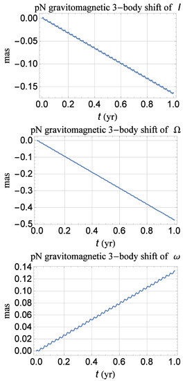 We successfully checked our analytical results of Equations (4)–(11) as follows. We considered a fictitious system orbiting a Jupiter-like body X along the same orbit of, say, Callisto, whose mass was assumed for the particle’s primary M, and numerically integrated its equations of motion over a time span much longer than with and without the pN gravitomagnetic acceleration of Equation (18) affecting the test particle; both the integrations, which assumed a purely Keplerian motion of about the fictitious body X, shared the same initial conditions for the test particle and its primary. For X, the same physical properties of Jupiter were assumed, including the size and the orientation of its angular momentum . As a result, numerically produced times series of the orbital elements of the putative probe were produced by subtracting the purely classical ones from those obtained by including also Equation (18) in the equations of motion; they are displayed in Figure 1. It turned out that the resulting numerically calculated pN gravitomagnetic 3-body orbital shifts agree with those computed by means of the analytical formulas of Equations (4)–(11).